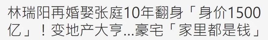 5月12日,台媒爆料称,林瑞阳再婚娶张庭10年后翻身猛涨,坐拥价值上亿的超级豪宅,家里都是钱,如今身家已经有1500亿。据悉,在林瑞阳娶张庭之前就已经是房产大亨了,而且当时的身价就已经超过330亿。在林瑞阳和张庭结婚之后,两人还创立了化妆品品牌,这个品牌现在也是越做越大,林瑞阳身价翻倍也是可以理解的事情。
