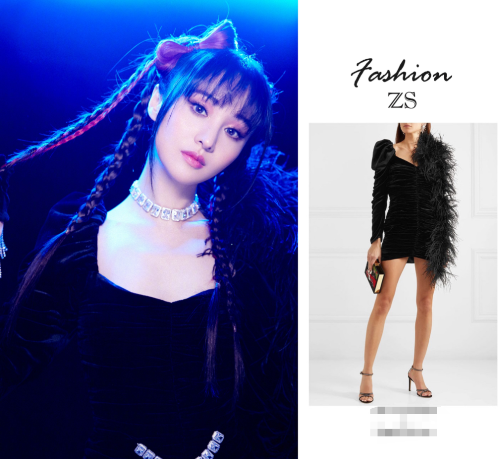 小香风的服装从去年至今一直是很受欢迎的单品,黑色丝绒的服装很有高级感,再加上单流苏设计,黑色羽毛拼接在肩膀上增强服装造型设计魅力。低领大v字领口,娃娃袖褶皱设计加持,虽说是“黑户”造型,却有小女生的可爱一面。