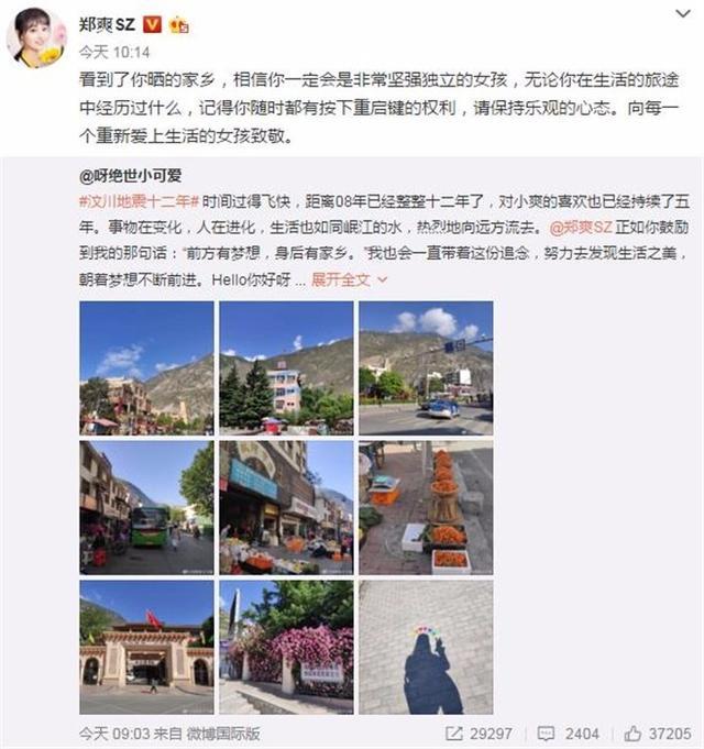 1905电影网讯5月12日是汶川地震12周年,一位郑爽的粉丝在微博上晒出了家乡汶川重建后的美景,并且感谢郑爽给予她的坚强乐观:“正如你鼓励到我的那句话‘前方有梦想,身后有家乡。’我也会一直带着这份追念,努力去发现生活之美,朝着梦想不断前进。”