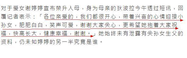 只不过对于女儿的老公是谁,她始终闭口不谈,不知道是不想说,还是真的不清楚。但是毕竟谢婷婷当了母亲,自己这个当姥姥的心情还是相当的激动。