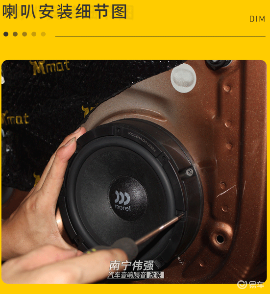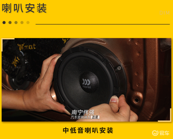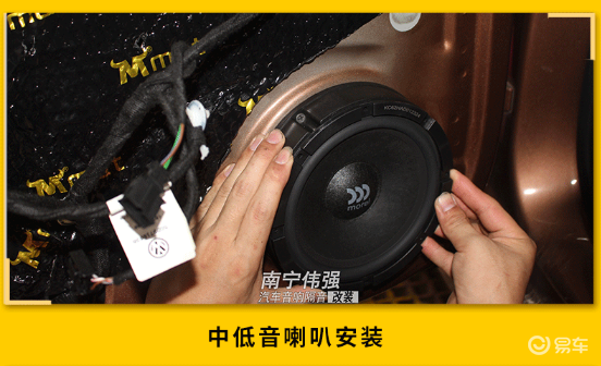 在喇叭安装的整个施工过程中,各种设备的布局、走线是十分重要的,中低音喇叭安装在车门板的原位处。