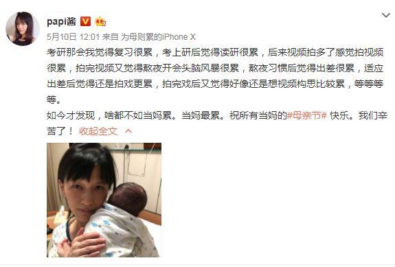 网红papi酱前不久升级当妈,多次在社交平台分享辛苦带娃的日常,母亲节当天还晒照说自己当妈最累。