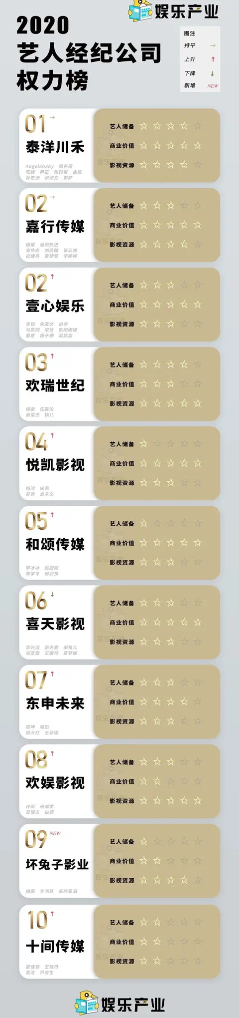 这年头什么样的榜单都有,从艺人到他们的公司几乎都有评价他们价值的榜单!2020年十大艺人经纪公司也出来了,让人奇怪的是去年通过《陈情令》大火的肖战和王一博的经纪公司哇唧唧哇和乐华娱乐居然跌出了前十,还挺让人意外的!