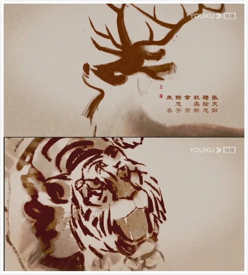 上部《军师联盟》的片头虽然没有使用主题歌,但是依然是对拍摄素材的剪辑,整体偏传统。而到了下部《虎啸龙吟》,片头使用了“五禽戏”中的五种动物以及鼎的形象,压根没出现人物。