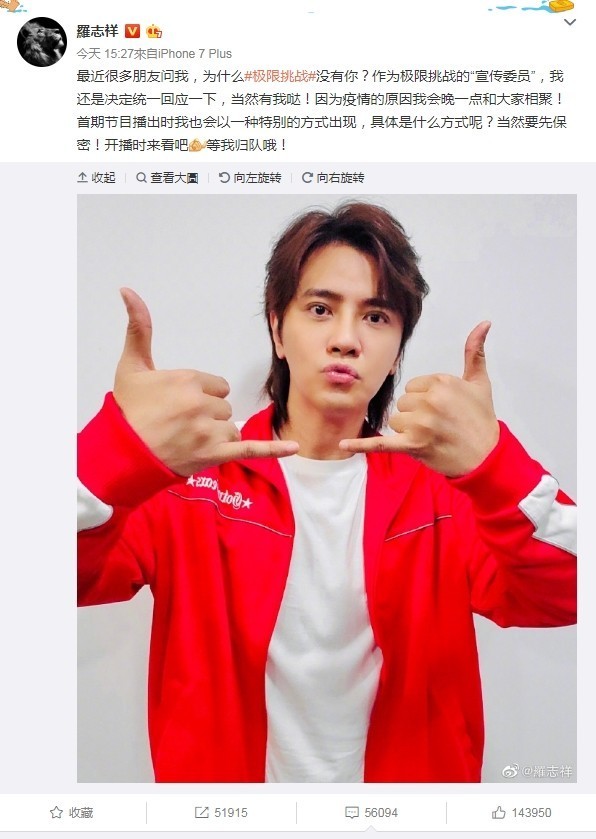 ▲罗志祥曾承诺会回归《极限挑战》,因分手丑闻消失节目。(图/翻摄自微博/罗志祥)