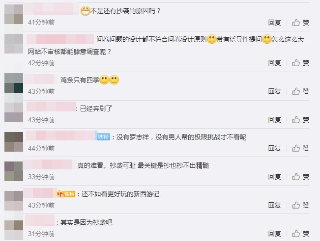 除了极限男人帮成员解散,网友更直指节目游戏内容抄袭韩综《新西游记》,批评「都看过了」、「还没人家搞笑」、「这次抄袭更狠。」有人坦言喜欢原本的班底,还有人建议换名字,「不是这个节目不够好,而是这个节目不再是极限挑战了。」其中也有罗志祥粉丝力挺留言:「没有罗志祥,没有男人帮的极限挑战才不看呢。」