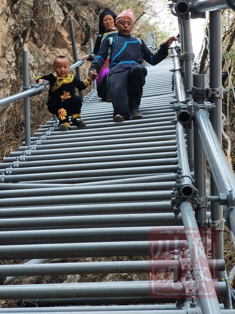 村民们沿着钢梯下山。