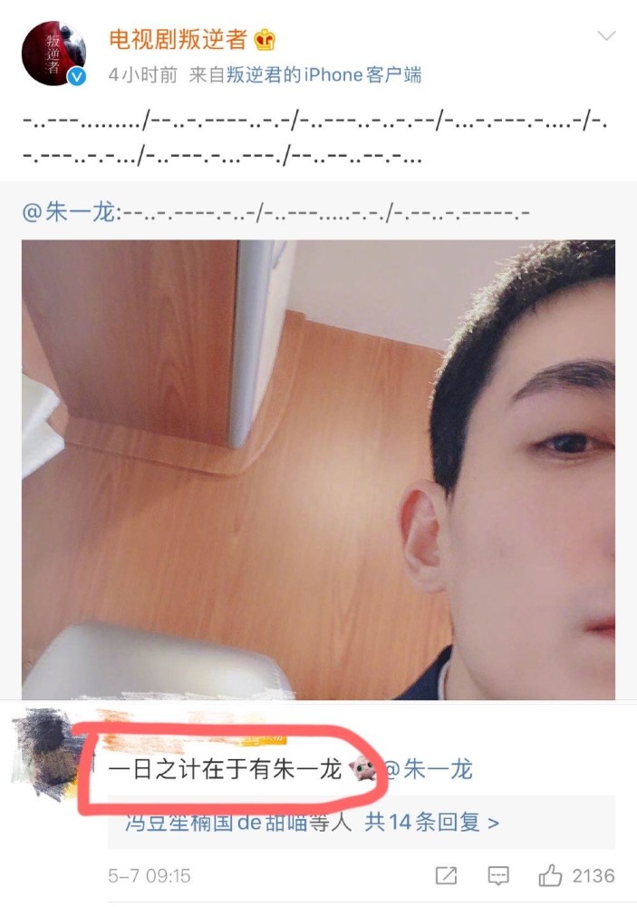 连《叛逆者》官博也来凑热闹,用摩斯密码评论说:一日之计在于晨。结果被粉丝们反驳说,一日之计在于有朱一龙。估计官博皮下的小姐姐要笑死了。