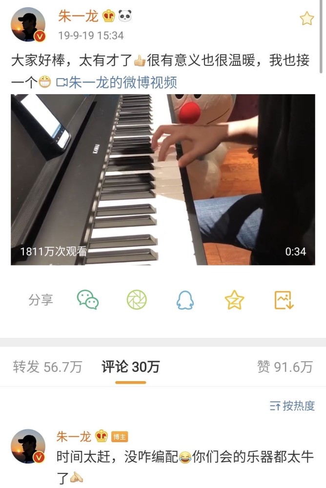 粉丝说想看他弹钢琴,1000万粉丝福利的时候他弹了,粉丝们觉得时间太短,没过瘾,他又跑到19年跨年晚会上弹,还是自弹自唱。