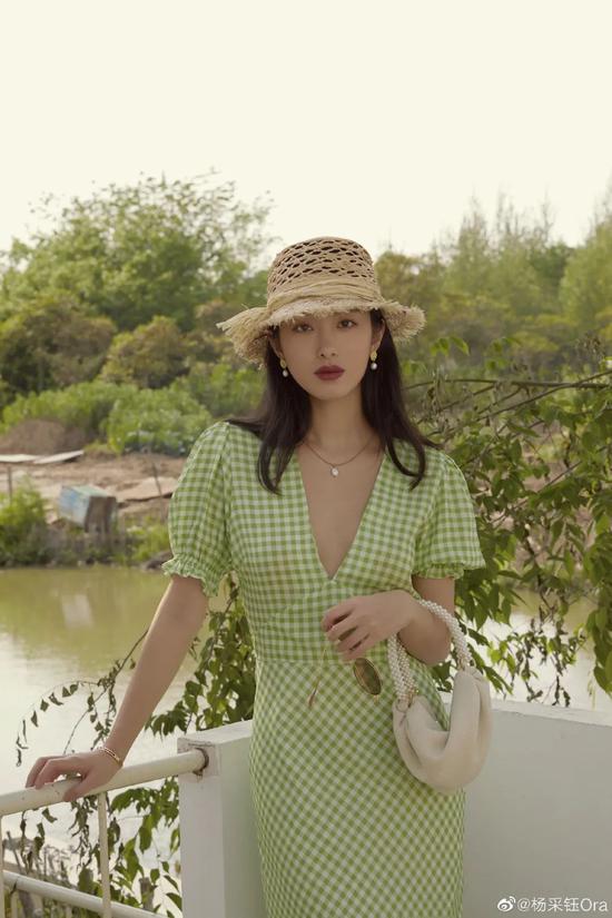 杨采钰这件绿白格子的连衣裙清爽干净,夏天穿上感觉就是一阵凉风吹来。而且正向格纹和斜格纹的拼接让格纹一点不会单调。搭配一个小小的手提包和草编帽,野餐怎么穿最美的示范在这啦。