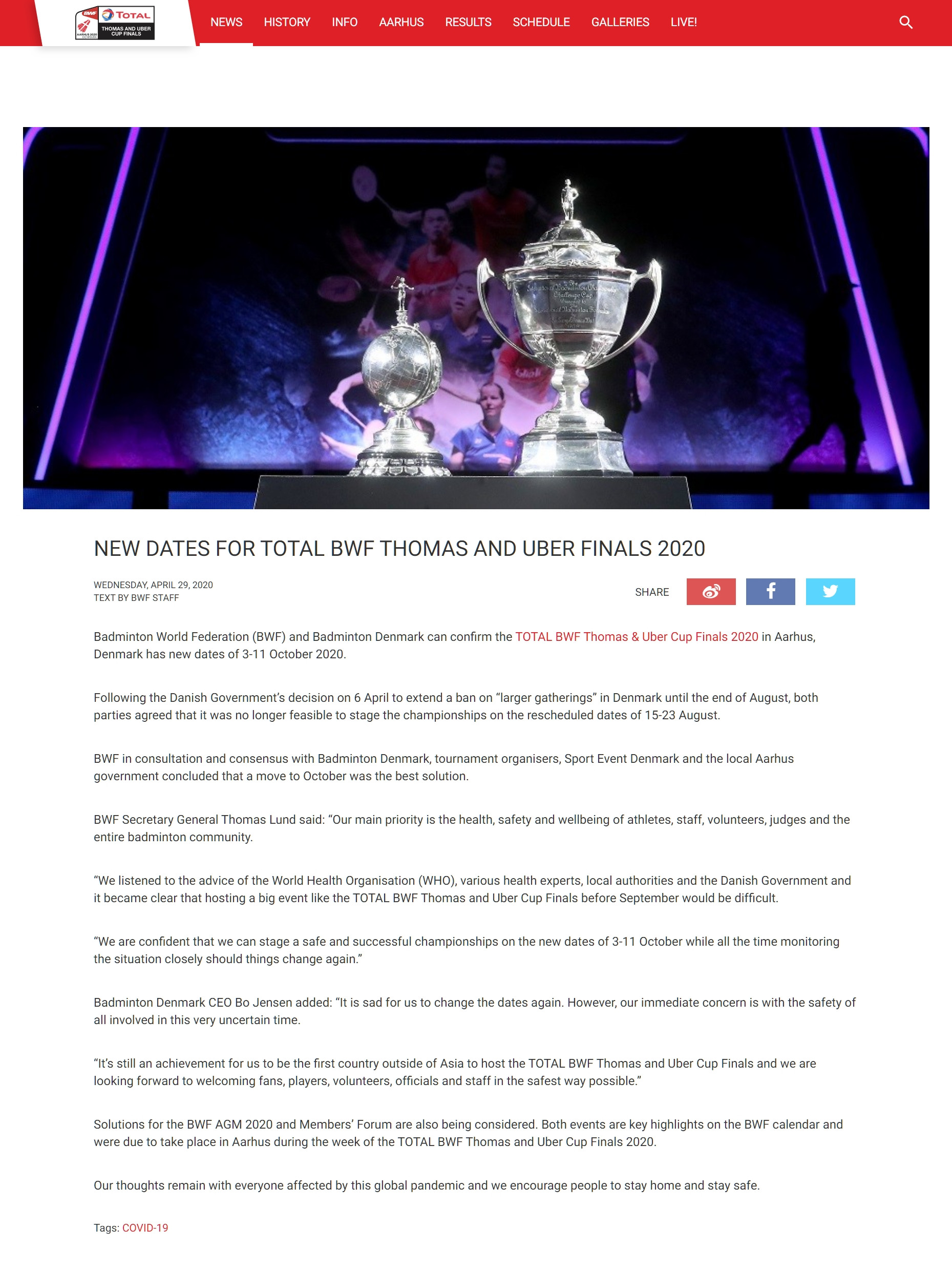 汤姆斯杯和尤伯杯羽毛球团体赛原定5月16日至24日在奥胡斯举行。世界羽联3月20日宣布因新冠疫情蔓延,赛事将推迟到今年8月15日至23日举行。