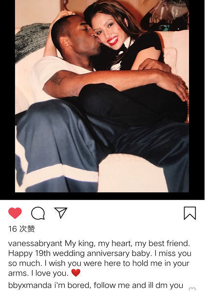 北京时间4月19日,科比遗孀瓦妮莎更新社交媒体,他晒出了一张自己和科比的亲密合照,纪念两人结婚19周年,这本来应该是一个令人欢喜的时刻,但科比在年初遭遇空难,离开了人世,如今虽然是他和瓦妮莎19周年结婚纪念日,却已经天各一方。