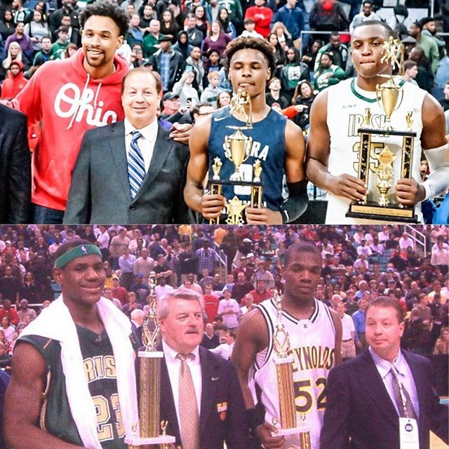 第二天一早,勒布朗在社交媒体说“昨晚对我来说真是一种超现实的感觉”,他还分享了一张对比照片,上面是小勒布朗获得MVP的样子,而下面是17年前当爹的率领圣文森特・圣玛丽高中队取得胜利后的样子。