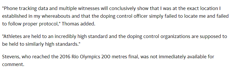 没有想到的是,近日,又有一位冠军级选手也开始“反击”检测人员,她就是美国短跑世界冠军加-托马斯。近日,独立于世界田联的田径诚信委员会宣布,美国女子短跑选手史蒂文斯和加-托马斯因为“没有报告行踪”,违反了相关规定而被田径诚信委员会临时禁赛。在得知被禁赛后,2018和2019年连续两年获得钻石联赛洛桑站女子200米冠军的托马斯非常不满,认为可以证明自己报告了确切地点,而检测人员没有遵守相关协议完成药检。她强调:“运动员必须遵守很高的标准,但是药检组织也应该遵守同样的高标准。”需要注意的是,因为没有完成检测,托马斯可能被禁赛2年。