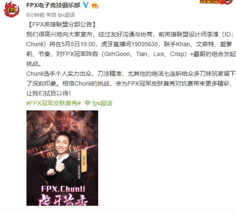 虎牙宣布将在5月5号开始冠军皮肤首秀,这次皮肤首秀里面我们看到FPX的队员们和虎牙的一些主播们将进行一场皮肤首秀的友谊赛,这次比赛还是非常让人期待的,最重要的是,这次的冠军皮肤首秀里面,FPX的老板也宣布要参加了。