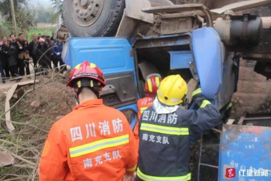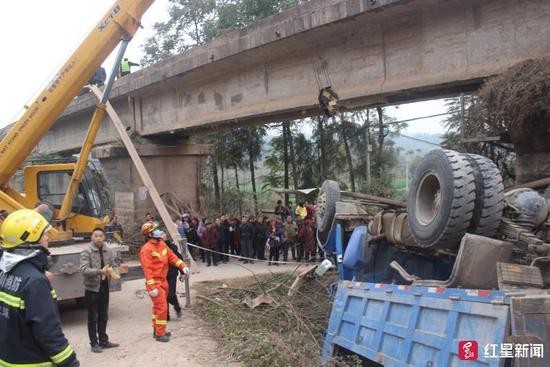 2月20日早上,南充市蓬安县消防大队接群众报警称,位于利溪镇往三坝方向铁路桥出口处,一货车发生车祸,从4米多高的桥上坠落仰翻,有人员被困。