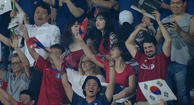 场边的韩国球迷挥舞着国旗庆祝,还有穿着利物浦球迷的外国人。
