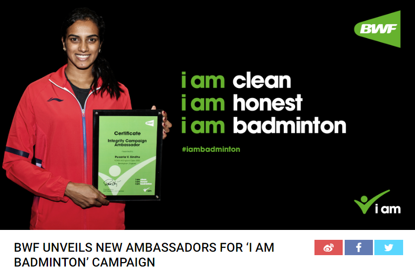 世界羽联官方在2015年,正式推出“诚信大使”评选,号召羽毛球选手诚信打比赛,拒绝服用兴奋剂。在过往评选当中,国羽奥运冠军谌龙,还有丹麦世界冠军安赛龙、日本奥运女双组合松糕组合,以及世界羽联主席拉尔森等,均是当选过诚信大使。