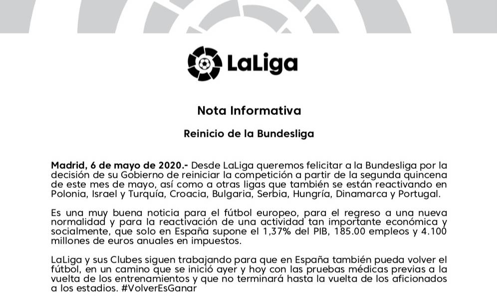 西甲:“恭喜德甲在政府支持下做出重启联赛的决定,我们将继续致力于回归,一直努力直到球迷能重新回到赛场观赛。”