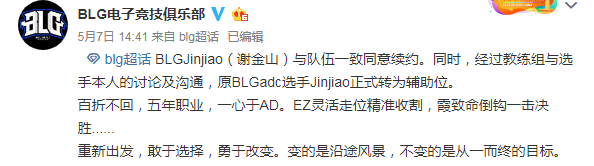 BLG官方:百折不回,五年职业,一心于AD。重新出发,敢于选择,勇于改变。变的是沿途风景,不变的是从一而终的目标