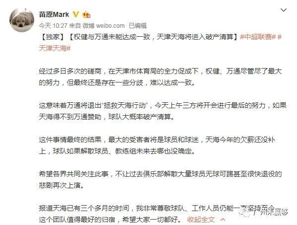 据《体坛周报》、记者苗原、媒体人李璇、记者郭欢报道称,万通和天海双方还没有达成一致,中国足协也没有收到球队方面递交的材料,万通将取消对天海俱乐部的赞助计划,天海将大概率进行破产清算,球队或解散。