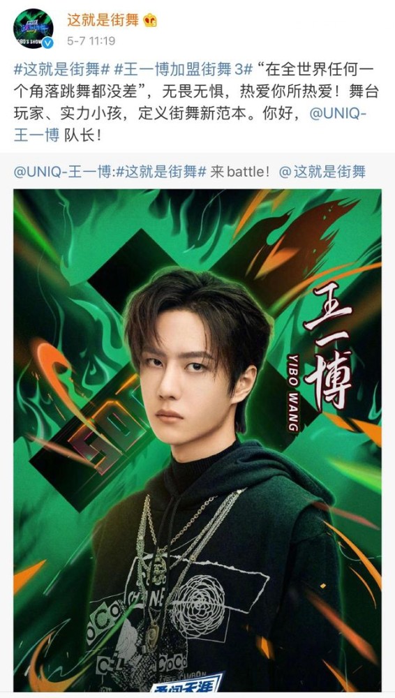 芒果TV在微博中说到:起始于IBD顶尖街舞大赛16强的少年天才,获得过美国International-K Music Awards最佳编舞奖的团体主舞担,oldschool出身,专业的街舞实力,天赋与能力绝佳,#这就是街舞#队长@UNIQ-王一博 来了。在《天天向上》中,还能见到王一博的开场舞。神的孩子,请开始你的舞蹈!