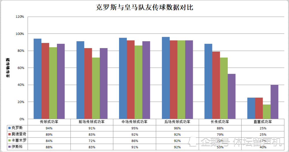 这里着重强调了克罗斯在传球方面的表现,毕竟作为球队前场发牌人,这是一项最关键的指标。如前文所言,克罗斯在速度方面并不擅长,在讲究高度对抗的当下,这是一个致命的短板,尤其是皇马这种豪门,如果前场发牌人过于“古典”,那么肯定是无法立足的!