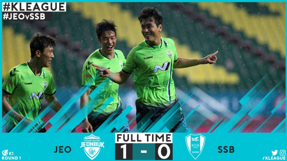 但上帝似乎刻意安排如此高光的剧本,第60分钟,李同国换下曹圭成,此后随着水原队的安东尼斯染红下场,全北的攻势一浪高过一浪。第84分钟,全北左侧开出角球,李同国如旱地拔葱,一记漂亮的头球打破僵局。2020赛季K联赛首球诞生!进球后他做出了一个手语手势的庆祝动作,以示感谢医务人员在新冠疫情期间的辛劳付出。