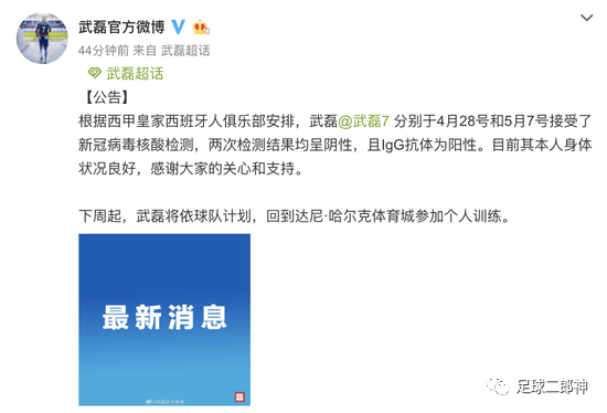 根据西甲皇家西班牙人俱乐部安排,武磊分别于4月28号和5月7号接受了新冠病毒核酸检测,两次检测结果均呈阴性,且IgG抗体为阳性。目前其本人身体状况良好,感谢大家的关心和支持。