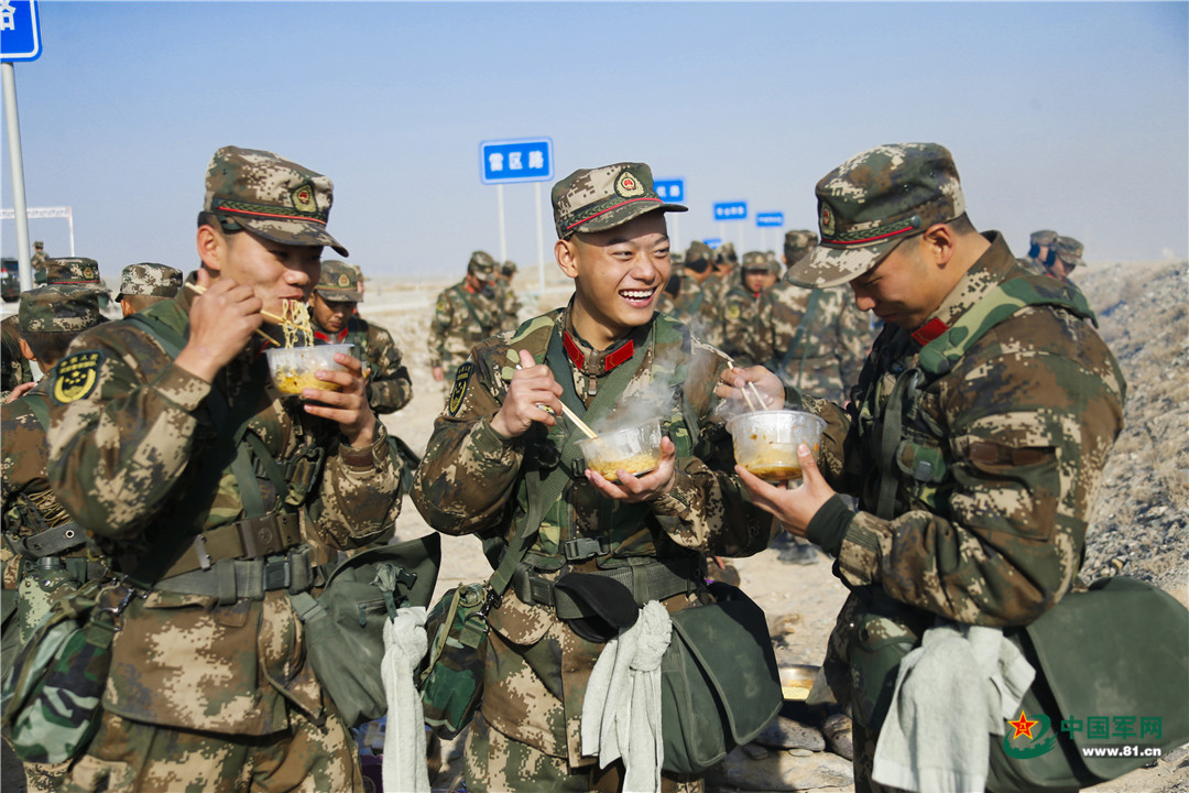 外训路上,兵哥笑逐颜开。果志远 摄 野营拉练途中午餐间隙,新战士们在交流自己成长心得。 陆文凯 摄
