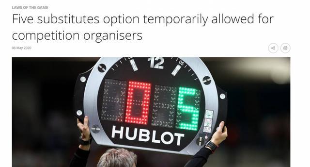 近日,国际足联正式宣布,为保护球员健康,IFAB(国际足球协会理事会)已经批准对足球规则临时做出修改。每场比赛每队允许换5人,但需在3次内完成,该规则限定在2019/20和2020/21赛季,将于今年6月1日生效。