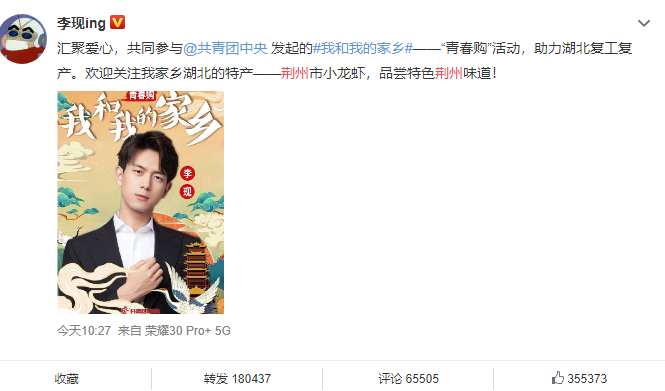 今天,荆州籍影视明星李现发了一条微博,给大家推荐家乡特产荆州小龙虾,并号召大家购买助力湖北复工复产,这一举动也让荆州小龙虾进入了更多人的视野。