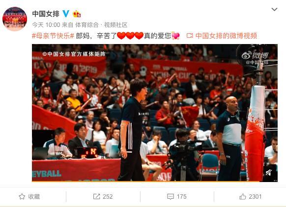 今天是母亲节,中国女排官方微博发布视频,致敬郎平指导:“郎妈辛苦了,真的爱您!”