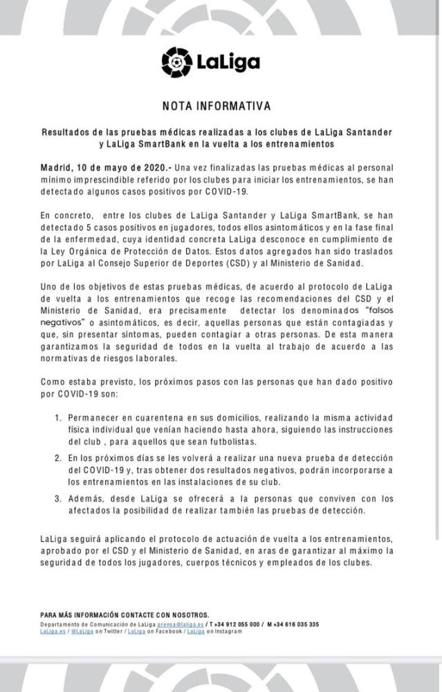 北京时间5月10日,西甲官方:对西甲、西乙所有球队进行了新冠病毒检测,共有5例阳性,且均无症状。
