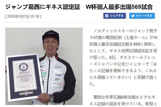 5月7日,综合日本媒体报道,日本跳台滑雪名将葛西纪明(47岁),以569次的成绩刷新世界杯个人最多参赛纪录,获得了吉尼斯世界纪录认证证书。