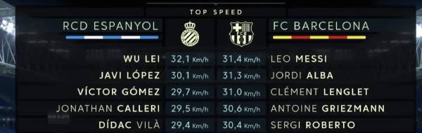 从统计数据可以看到,武磊不仅仅收获了关键进球,让昔日里2-2绝平的一幕重现。他在比赛中的速度,更是快得惊人。不仅仅远远甩开队友,也是让梅西和阿尔巴“望尘莫及”。