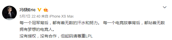 5月8日腾讯电竞带着#真实电竞#的词条发文,疑似对这件事情表态,此后各大俱乐部纷纷发文,腾竞的负责人也表示:没有授权,没有合作,请尊重LPL!