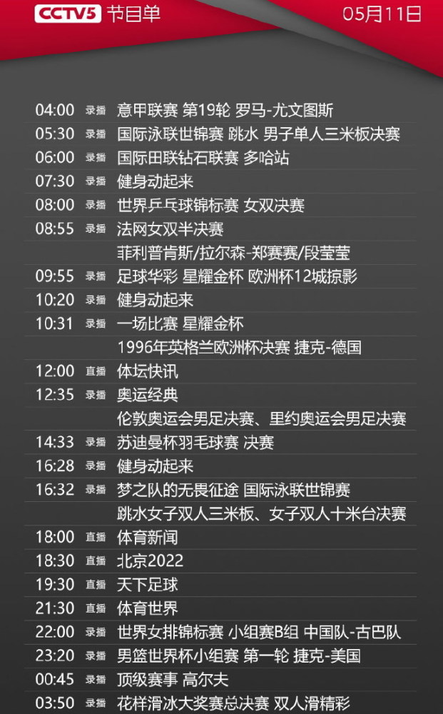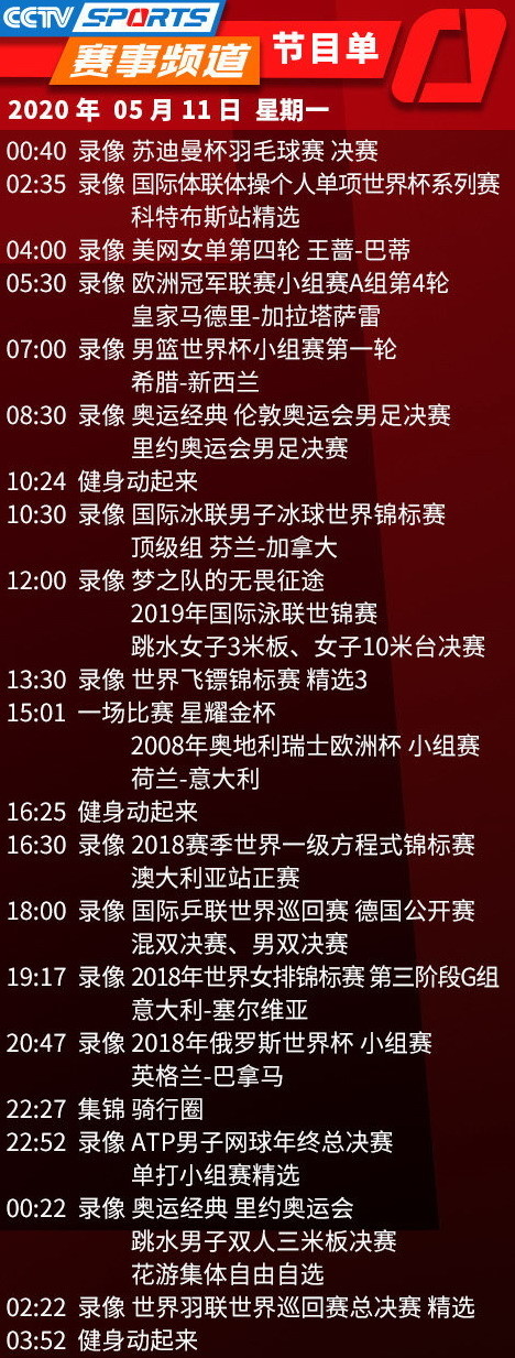 央视体育赛事频道CCTV5+全部节目均为录像和集锦。