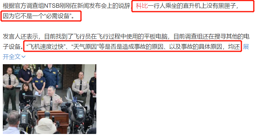 发布会上,调查组人员表示科比所乘坐的直升机上并没有黑匣子,因为对于私人直升机来说,这并不是“必需设备”,官方只能通过搜索其他的电子设备来确定最终的事故原因,目前只能找到飞行员使用的一个平板电脑,包括随行人员携带的电子设备,也还在进一步的搜查中。