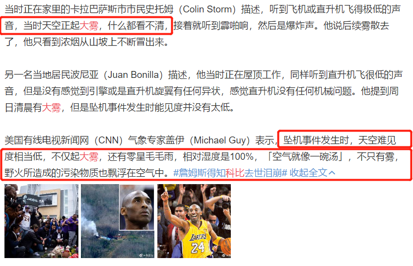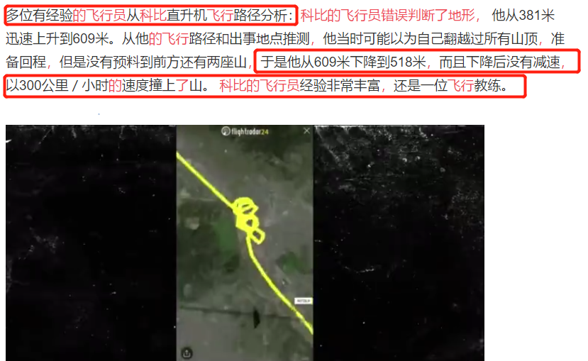 有报道称,多位有经验的飞行员从科比直升机飞行路径分析:从他的飞行路径和出事地点推测,科比的飞行员由于大雾看不清地形,错误地判断了地形,最终导致悲剧的酿成。