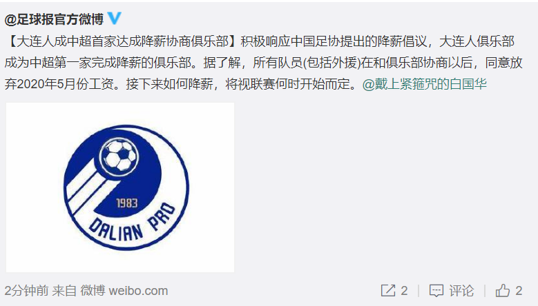 5月11日,中超联赛首家降薪俱乐部确定,足球报的消息显示,大连人俱乐部的球员确定放弃5月份的薪水,接下来的降薪计划,还要看联赛开始的时间而定。