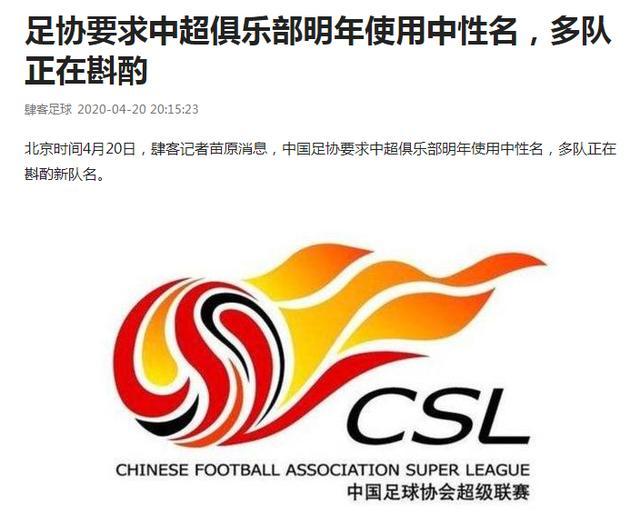 根据足球记者苗原的消息,中国足协要求中超俱乐部明年使用中性名,多队正在斟酌新队名。根据足协的有关规定,2020赛季是中国足球职业联赛俱乐部最后一年使用与商业赞助相关的名称,各俱乐部必须在2021赛季之前更换中性化名称,否则不予联赛准入。
