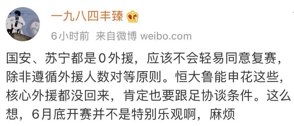 北京时间5月11日,来自广东知名媒体《南方都市报》记者丰臻的消息,2020赛季的中超在6月底重启,形势并没有特别乐观。这位广东名记甚至用了“麻烦”一词来形容。丰臻透露,多家中超俱乐部并不会轻易同意复赛,而重要原因,便是本队的外援都没有回来。