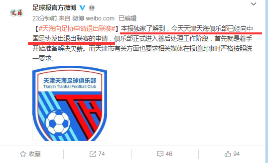 中超俱乐部 曝天海提出退出申请,闹剧将落下