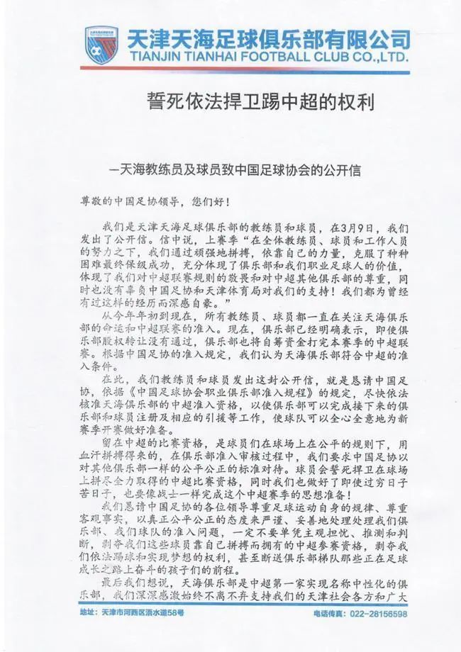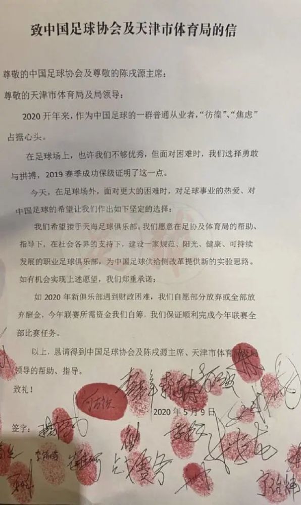 在此之后,再也没有任何迹象表明天海还存有生机。两天前,以副总经理李玮锋为代表的多名教练、一队球员和预备队球员,以签名按手印的方式,发布了一份《致中国足球协会及天津市体育局的信》。