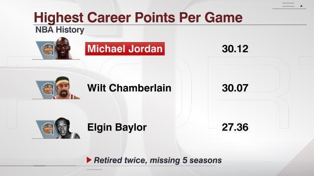 据权威数据统计网站ESPN StatsInfo统计,乔丹的场均得分为30.12分,排在历史第一。乔丹那两次退役一共让他缺席了347场比赛,而他与NBA历史总得分王贾巴尔的生涯总得分相差6095分。在生涯场均得分榜上排在第2和第3的分别为张伯伦(30.07分)和埃尔金-贝勒(27.36分)。