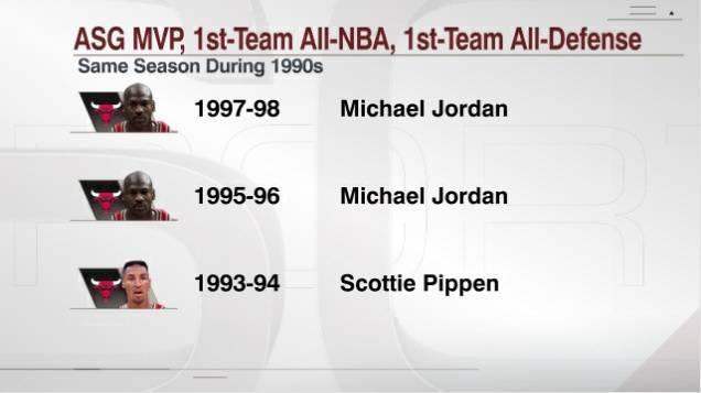 今日数据网站统计了在20世纪90年代中,有3次出现一球员在单赛季获得全明星赛MVP,并入选了最佳阵容一阵和最佳防守阵容一阵。这其中乔丹有两次,皮蓬有一次。皮蓬是在1993-94赛季,也就是乔丹退役第一个赛季,他凭借在全明星舞台上29分11篮板2助攻4抢断的表现拿到了全明星赛MVP,同年他也入选了最佳阵容一阵和最佳防守阵容一阵;