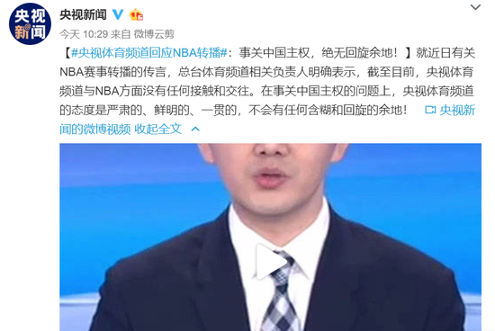 该负责人重申:“在事关中国主权的问题上,央视体育频道的态度是严肃的、鲜明的、一贯的,不会有任何含糊和回旋的余地!NBA高层对此应该是清楚的。”自从莫雷事件发生之后,央视还未转播过一场NBA比赛。