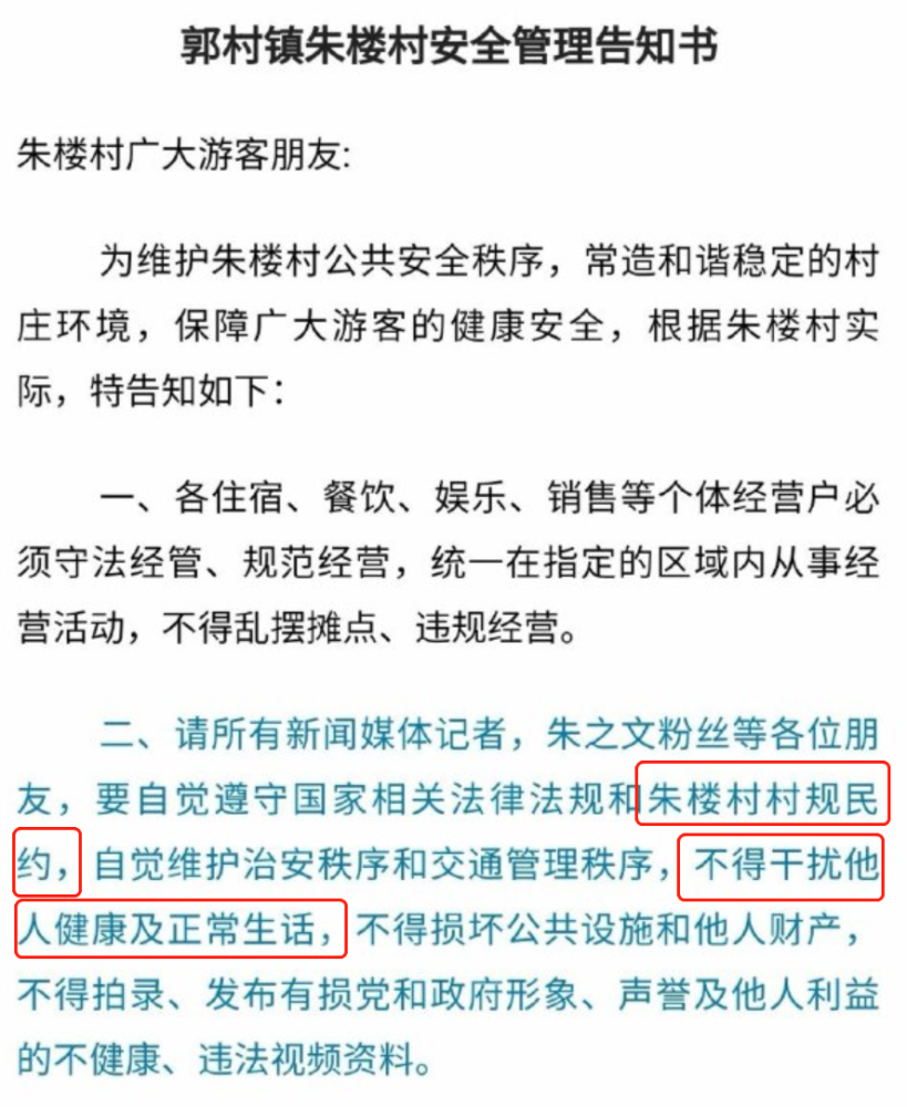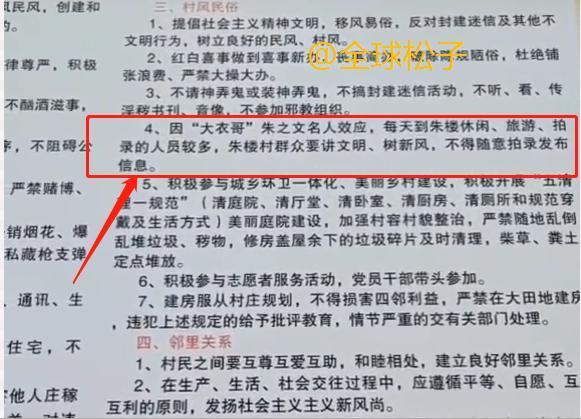 要求外地的游客和拍客,遵守朱楼村的村规民约。村规民约有一条特别强调要“讲文明、树新风,不得随意拍录发布视频”。