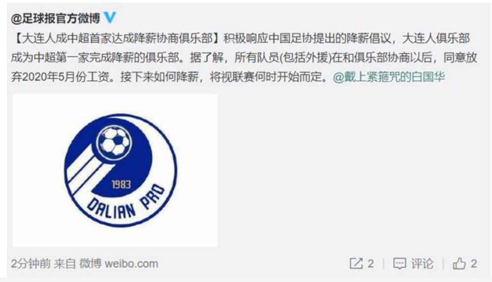 5月11日,中超联赛首家降薪俱乐部确定,据足球报透露,大连人俱乐部的球员确定放弃5月份的薪水,包括外援。至于接下来的降薪计划,还要看联赛开始的时间而定。在大连人之前,中甲的新疆队已经宣布降薪,成为第一支降薪的中国俱乐部球队。至于其他球队的降薪方案,现在还没有明确的方案。